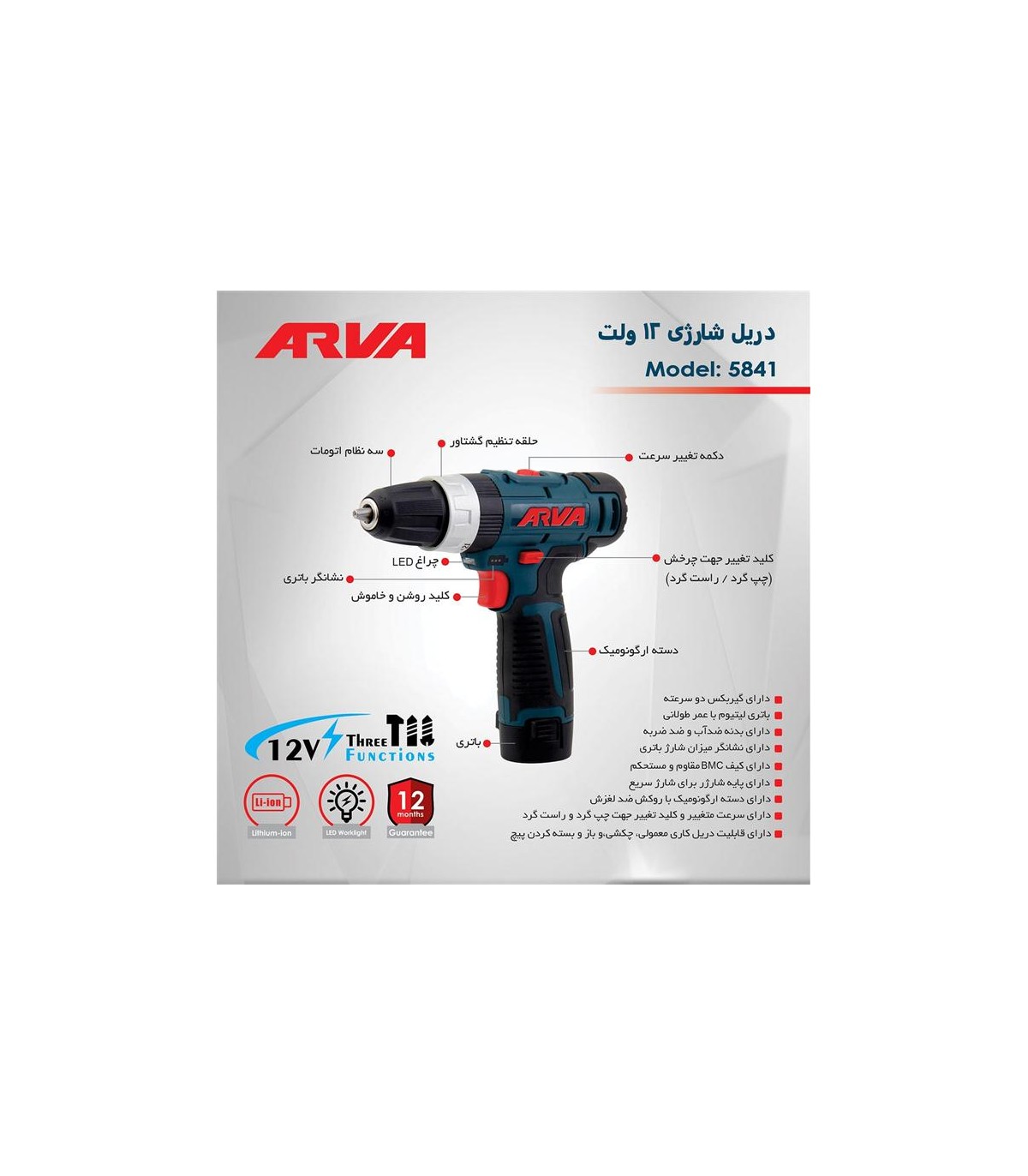 امروزه تقریبا یک دریل در هر خانه یا کارگاهی جهت سوراخ کردن انواع سطوح استفاده میشود. اما دریلهای شارژی به علت بیسیم بودن، در مکانهایی که پریز برق موجود نیست، کاربرد دارند و مورد استفاده قرار می گیرند. دریل شارژی آروا 5841 نوعی دریل شارژی است که هم زمان به عنوان دریل و پیچ گوشتی شارژی مورد استفاده قرار میگیرد.
